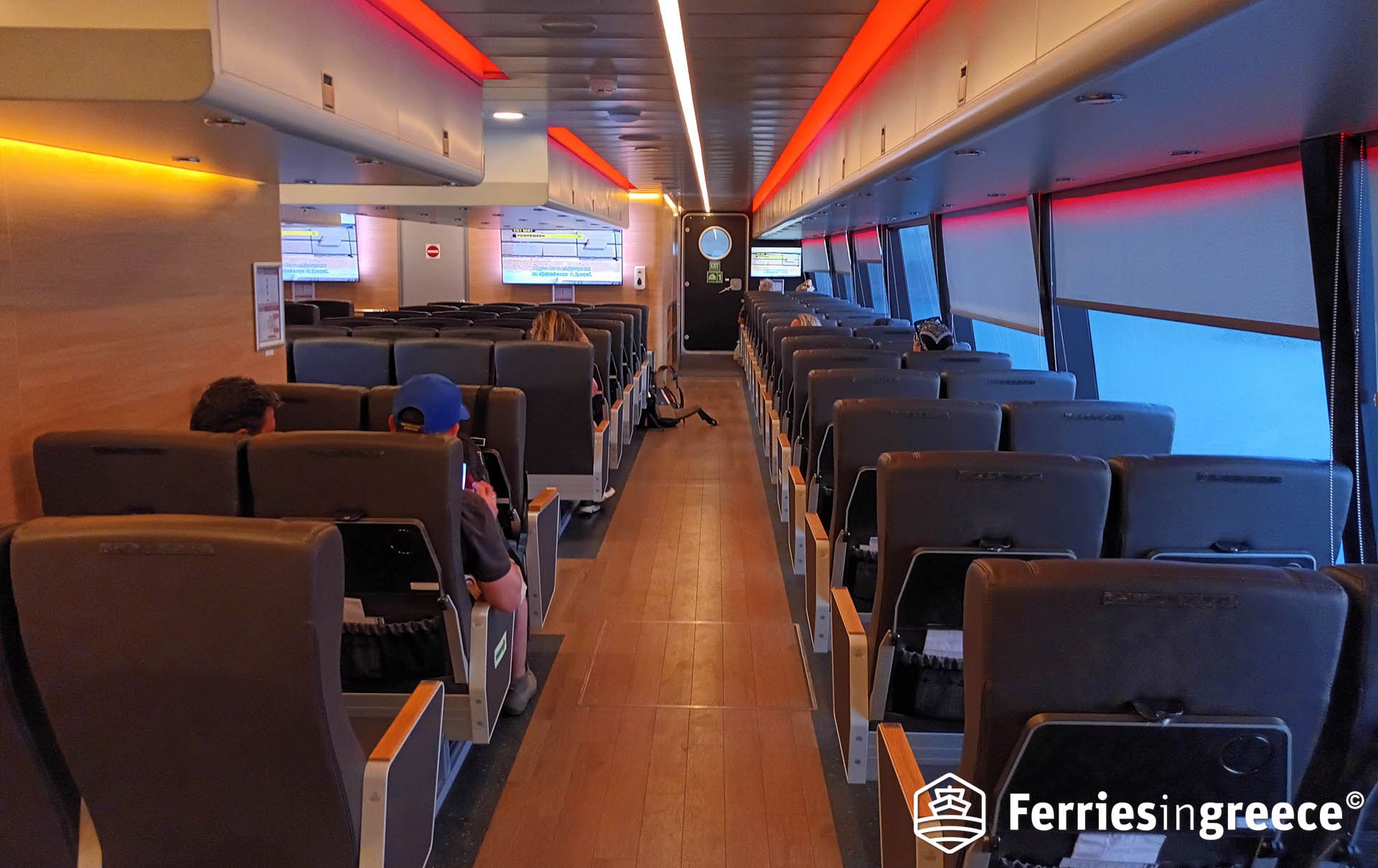 AERO 1 Highspeed ist ausschließlich mit nummerierten, verstellbaren Sitzen im Flugzeugstil ausgestattet, die sich über mehrere kleinere Salons verteilen. Diese sind für die kurzen Überfahrten im Saronischen Golf konzipiert, die vom Schiff bedient werden, und bieten den Passagieren eine zuverlässige Kombination aus Komfort und Zweckmäßigkeit. Die Sitzplätze werden bei der Buchung zugewiesen, sodass jeder Reisende einen reservierten Platz an Bord hat.