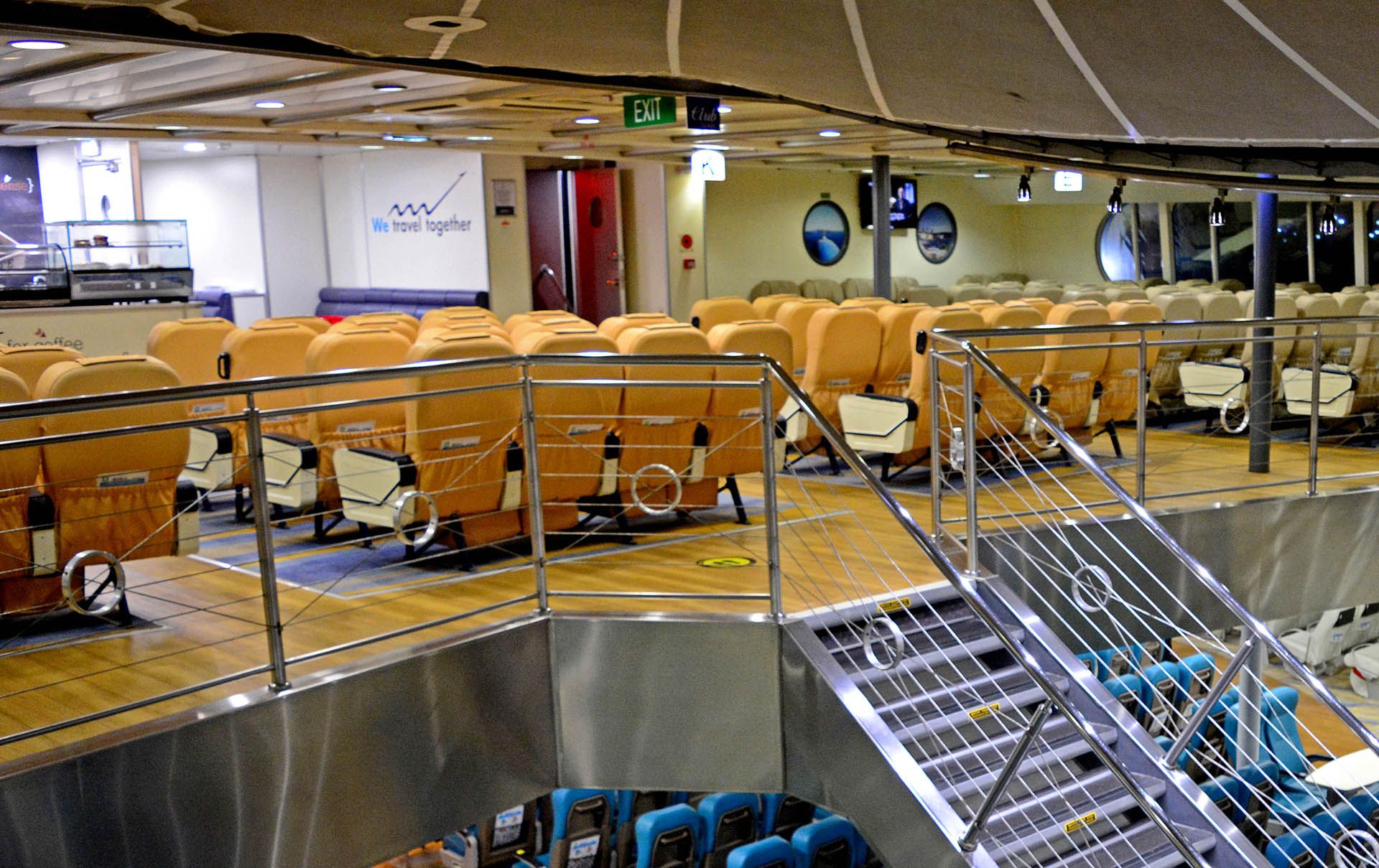 Die Champion Jet 1 verfügt über eine Snackbar und ein Café, die eine Auswahl an warmen und kalten Getränken, Sandwiches, Gebäck und leichten Snacks anbieten. Die Bar befindet sich im Hauptpassagiersalon und ist von allen Sitzbereichen aus leicht zugänglich.