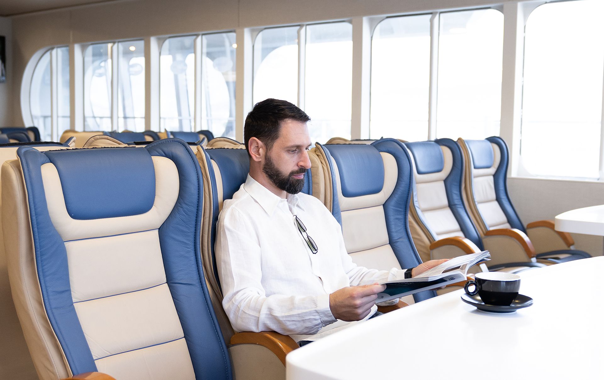 Die Standardkategorie auf der Champion Jet 2 ist die Economy (Silver) Class mit bequemen, nummerierten Sitzen im Flugzeugstil in großen, klimatisierten Lounges. Breite Fenster bieten Meerblick, und die Passagiere haben einfachen Zugang zur Snackbar und zu den Toiletten. Diese Klasse ist die wirtschaftlichste und praktischste Wahl.