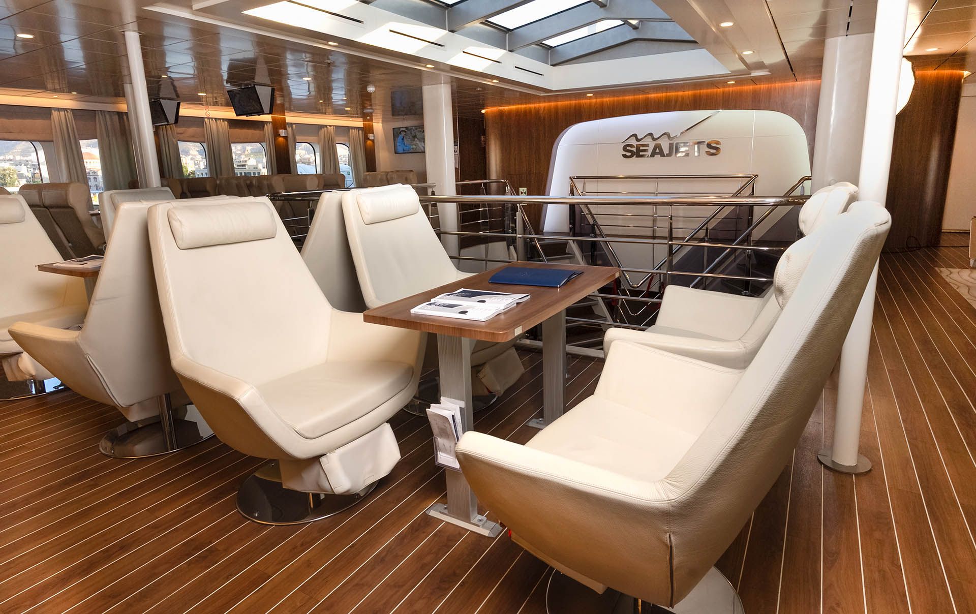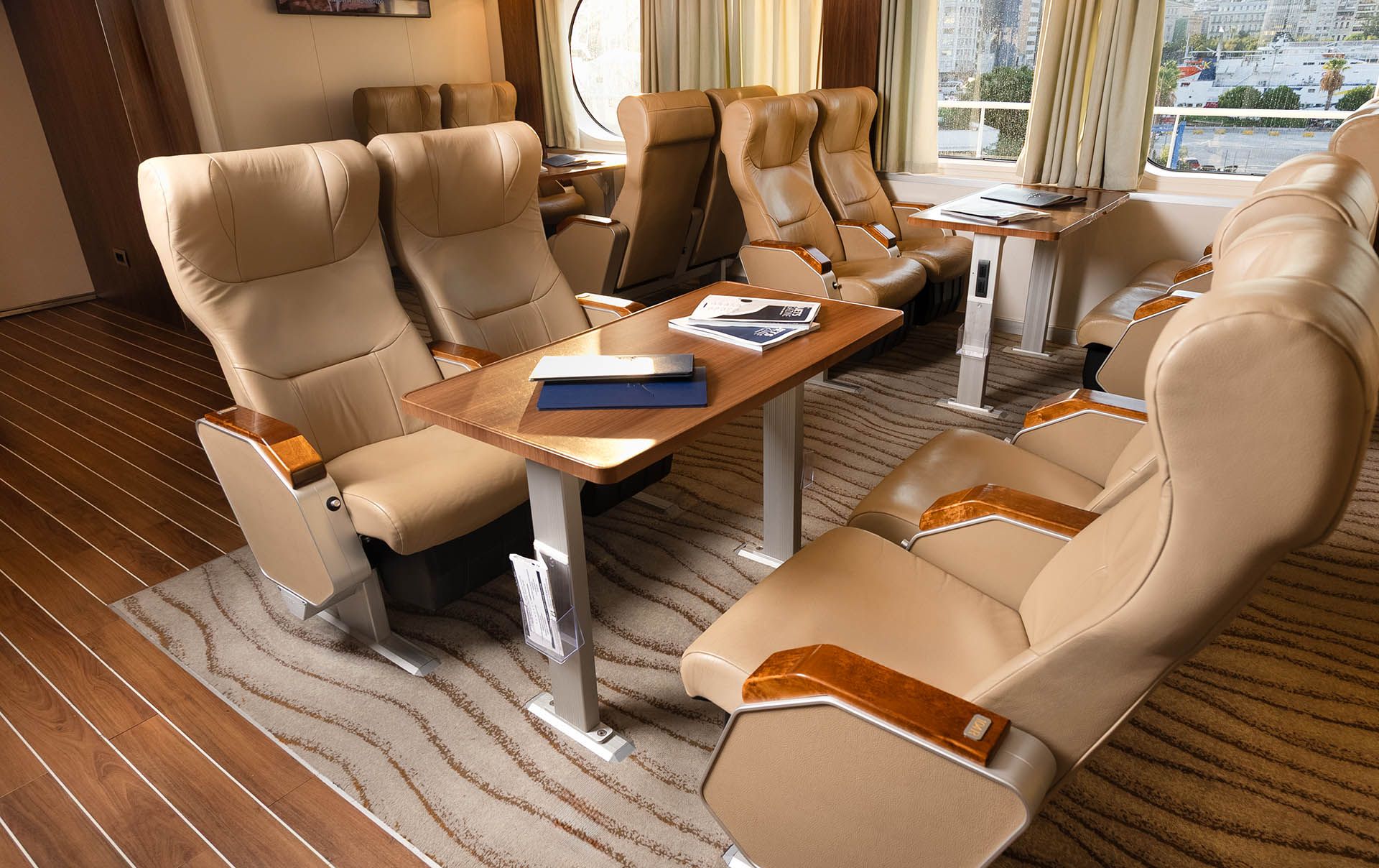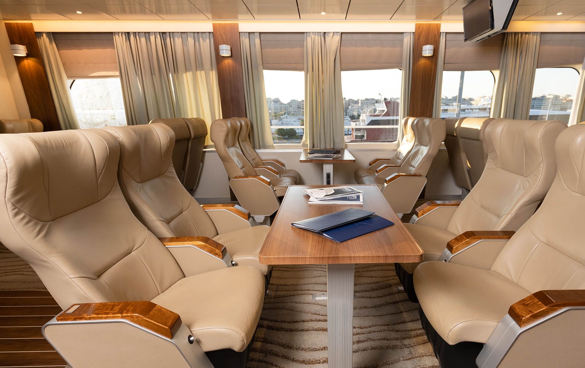 Auf der höchsten Komfortstufe bietet die Platinum Class eine exklusive und private Lounge-Atmosphäre mit großzügigen, verstellbaren Sitzplätzen, Panoramafenstern und einem ruhigen, hochwertigen Ambiente. Mehrere Sitzplätze sind um kleine Tische angeordnet, was für eine entspannte und gesellige Anordnung sorgt. Die Platinum Class ist die ideale Wahl für Passagiere, die auf längeren Strecken wie Athen-Santorin oder Athen-Folegandros maximalen Komfort und persönlichen Freiraum suchen und dabei Privatsphäre, Service und erstklassige Ausstattung genießen möchten.