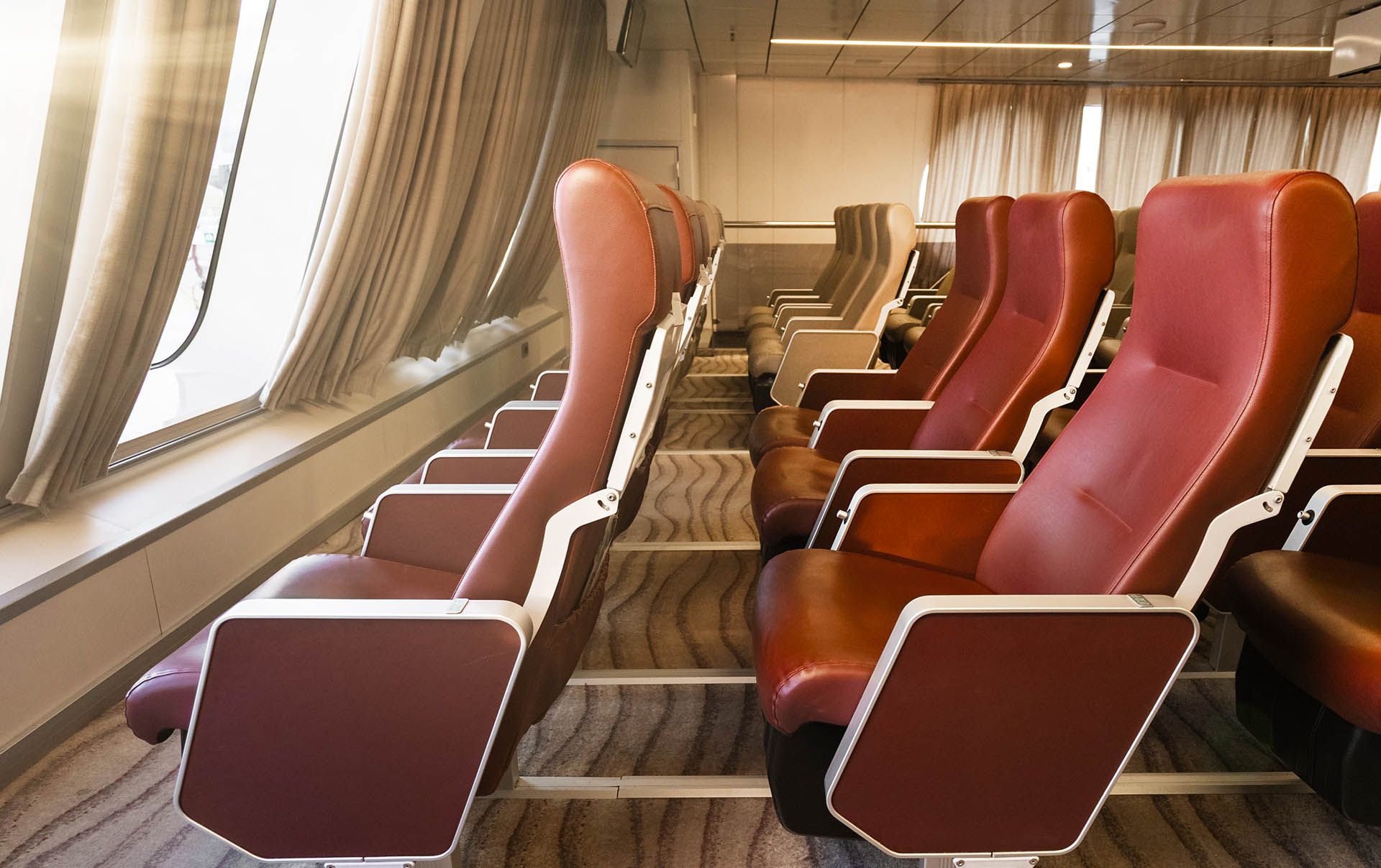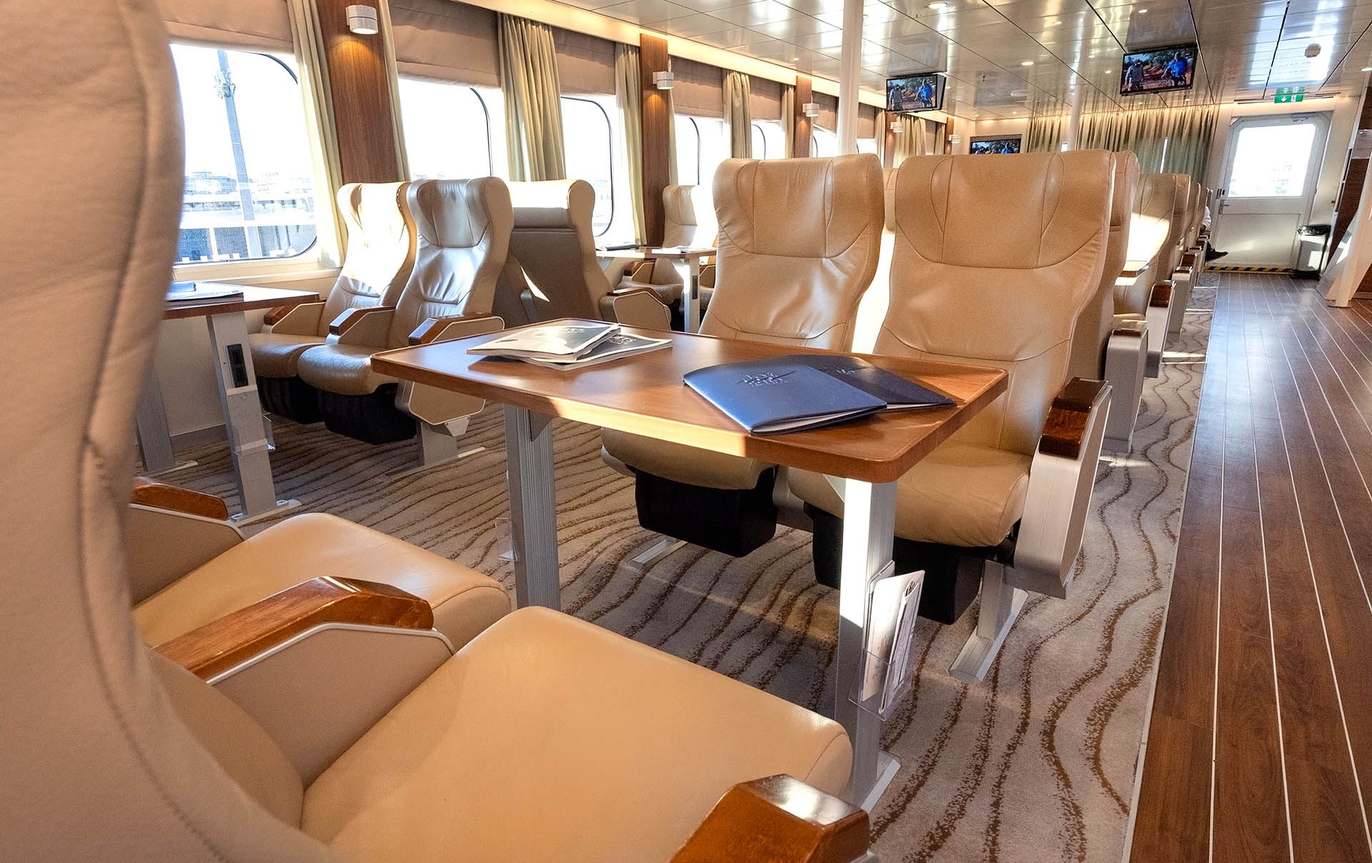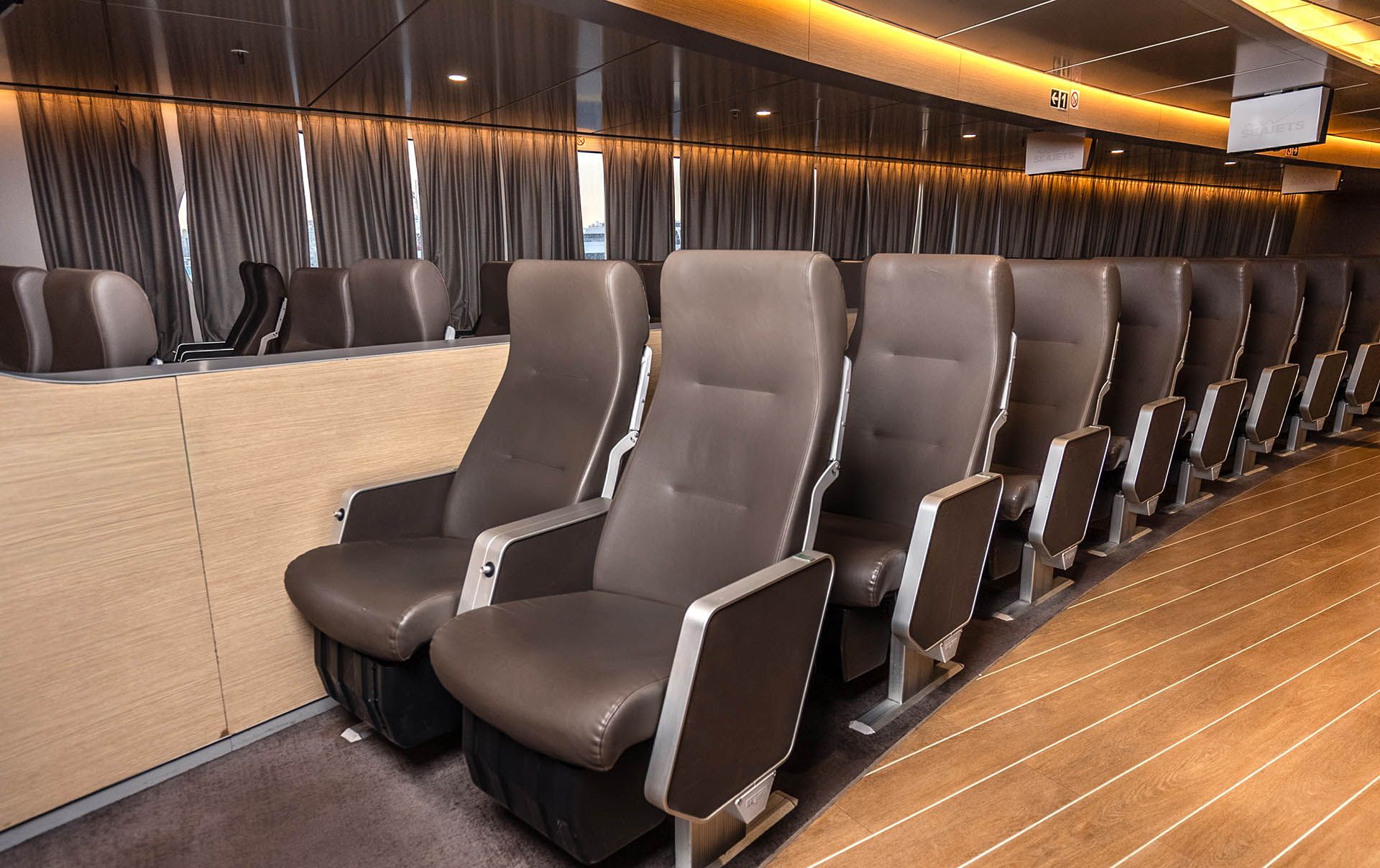 Auf der höchsten Komfortstufe bietet die Platinum Class eine exklusive und private Lounge-Atmosphäre mit großzügigen, verstellbaren Sitzplätzen, Panoramafenstern und einem ruhigen, hochwertigen Ambiente. Mehrere Sitzplätze sind um kleine Tische angeordnet, was für eine entspannte und gesellige Anordnung sorgt. Die Platinum Class ist die ideale Wahl für Passagiere, die auf längeren Strecken wie Athen-Santorin oder Athen-Folegandros maximalen Komfort und persönlichen Freiraum suchen und dabei Privatsphäre, Service und erstklassige Ausstattung genießen möchten.