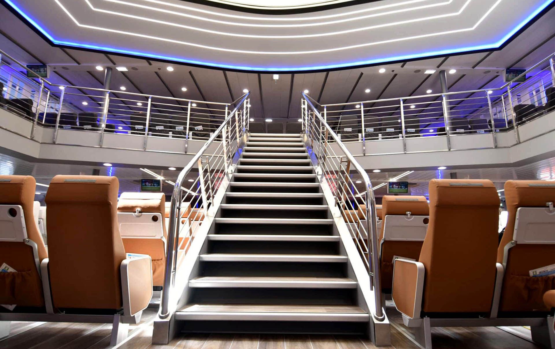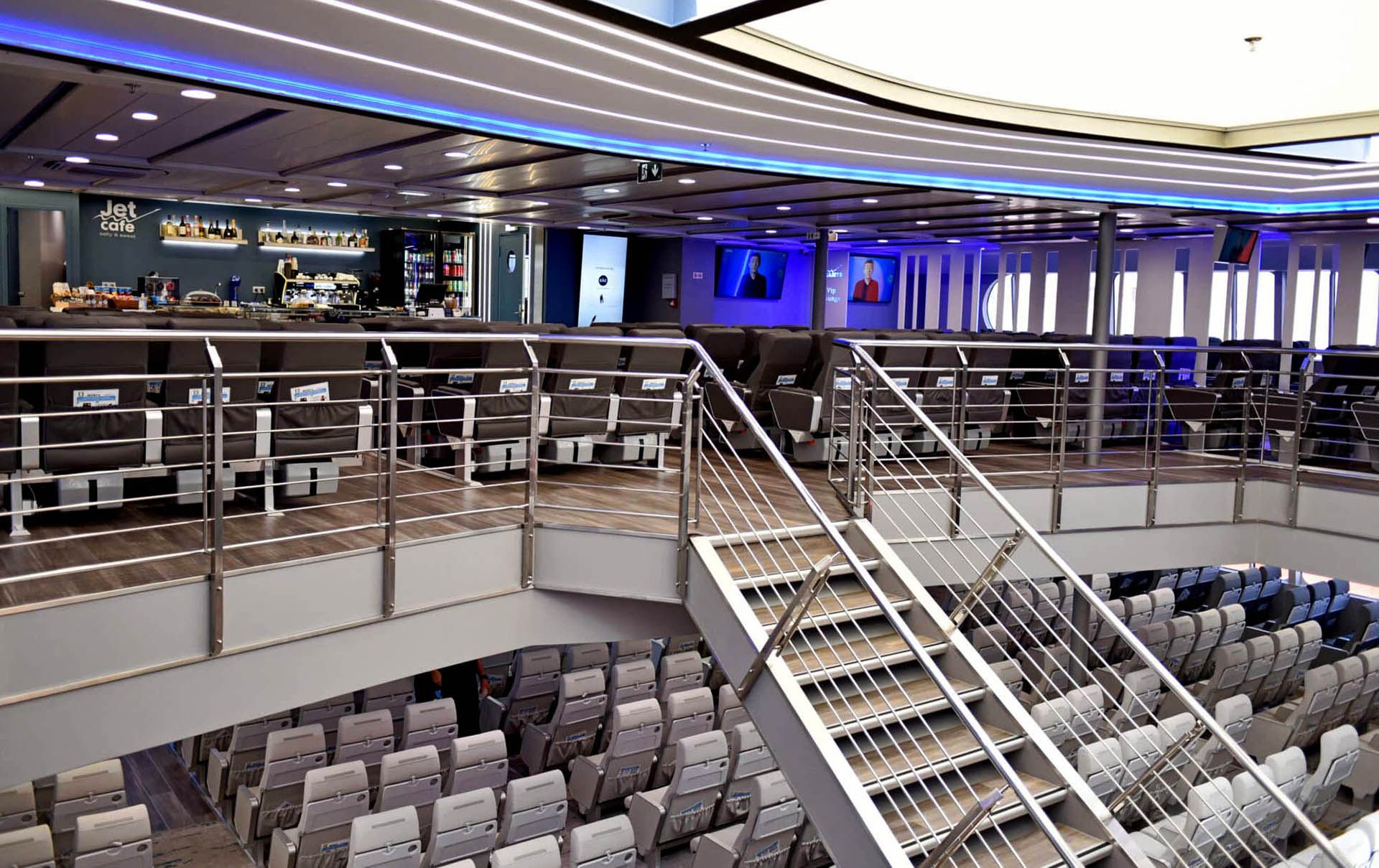L’opzione standard sul Champion Jet 3 è la classe Economy (Silver), con poltrone numerate in stile aeronautico disposte in ampi saloni climatizzati. Le grandi finestre offrono vista sul mare e i passeggeri hanno facile accesso allo snack bar e ai servizi igienici. Questa classe rappresenta la scelta più economica e pratica.